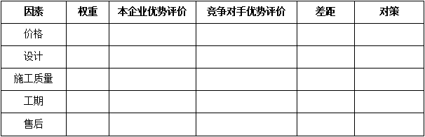 F、關(guān)鍵成交因素對(duì)比:對(duì)于某一個(gè)細(xì)分領(lǐng)域的客戶(hù)而言,成交的關(guān)鍵因素選項(xiàng)是相對(duì)清晰的,而這些因素對(duì)成交的影響權(quán)重是不同的,經(jīng)營(yíng)分析就需要識(shí)別競(jìng)爭(zhēng)對(duì)手在哪些關(guān)鍵成交因素上占據(jù)優(yōu)勢(shì)。例如:對(duì)于裝飾裝修工程行業(yè)的家庭客戶(hù)而言,其成交因素包括:價(jià)格、設(shè)計(jì)、施工質(zhì)量、工期、售后的維修維保服務(wù)等。對(duì)于一個(gè)收入中等的自住新房客戶(hù)而言,價(jià)格、設(shè)計(jì)因素、施工質(zhì)量是其主要成交因素,而對(duì)于商鋪、投資房產(chǎn)來(lái)說(shuō),工期的重要性不言而喻。如下表: